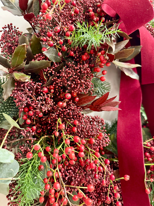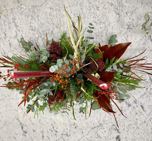 Arrreglo Floral Navideño en Tonos Burdeos con Base Dorada