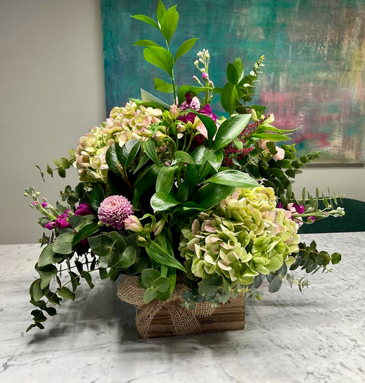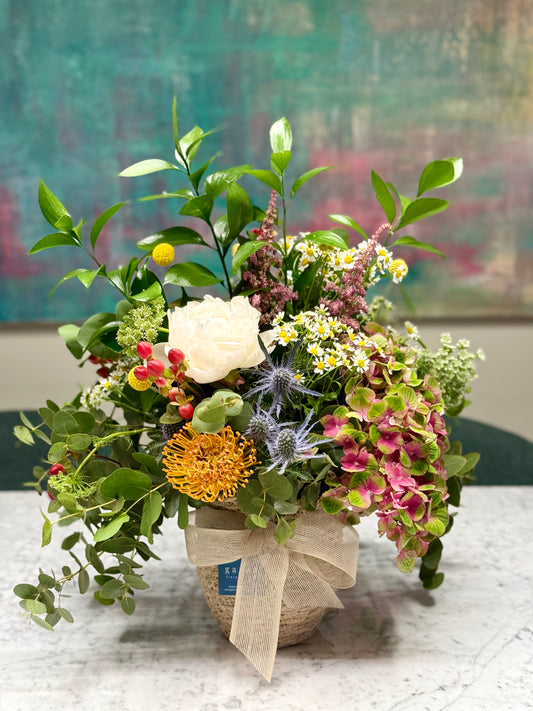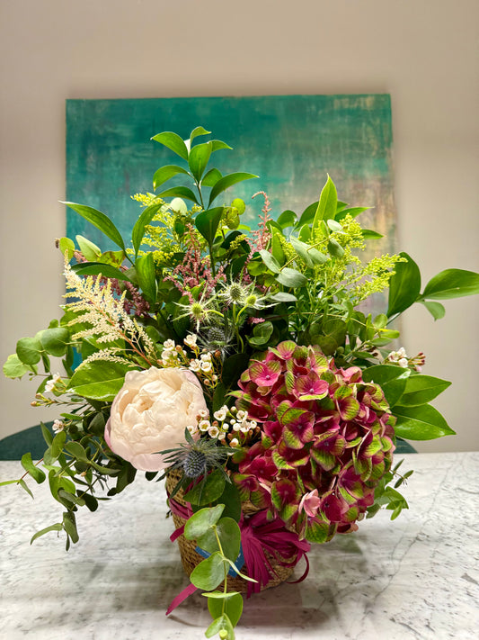 Arreglo Floral en Cesta de Hortensia y Paoenía