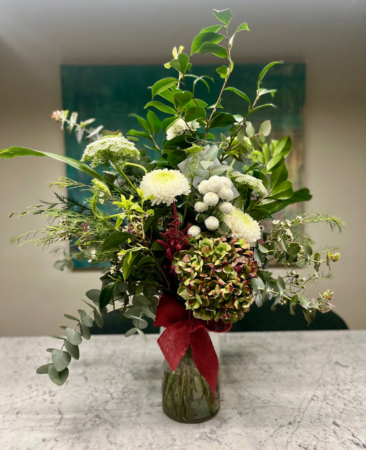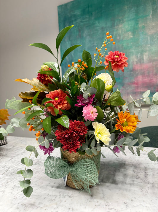 Arreglo Floral en tonos Rosas y Verdes en Base de Barro