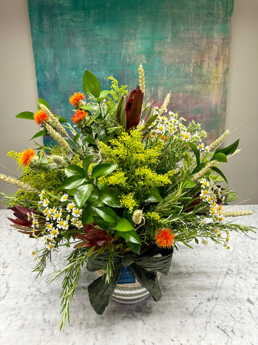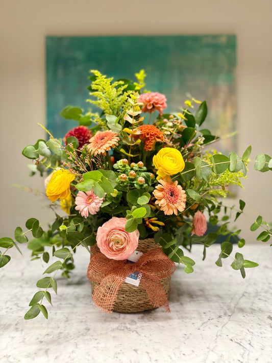 Arreglo Floral Tonos Naranjas y Azules en Cesta