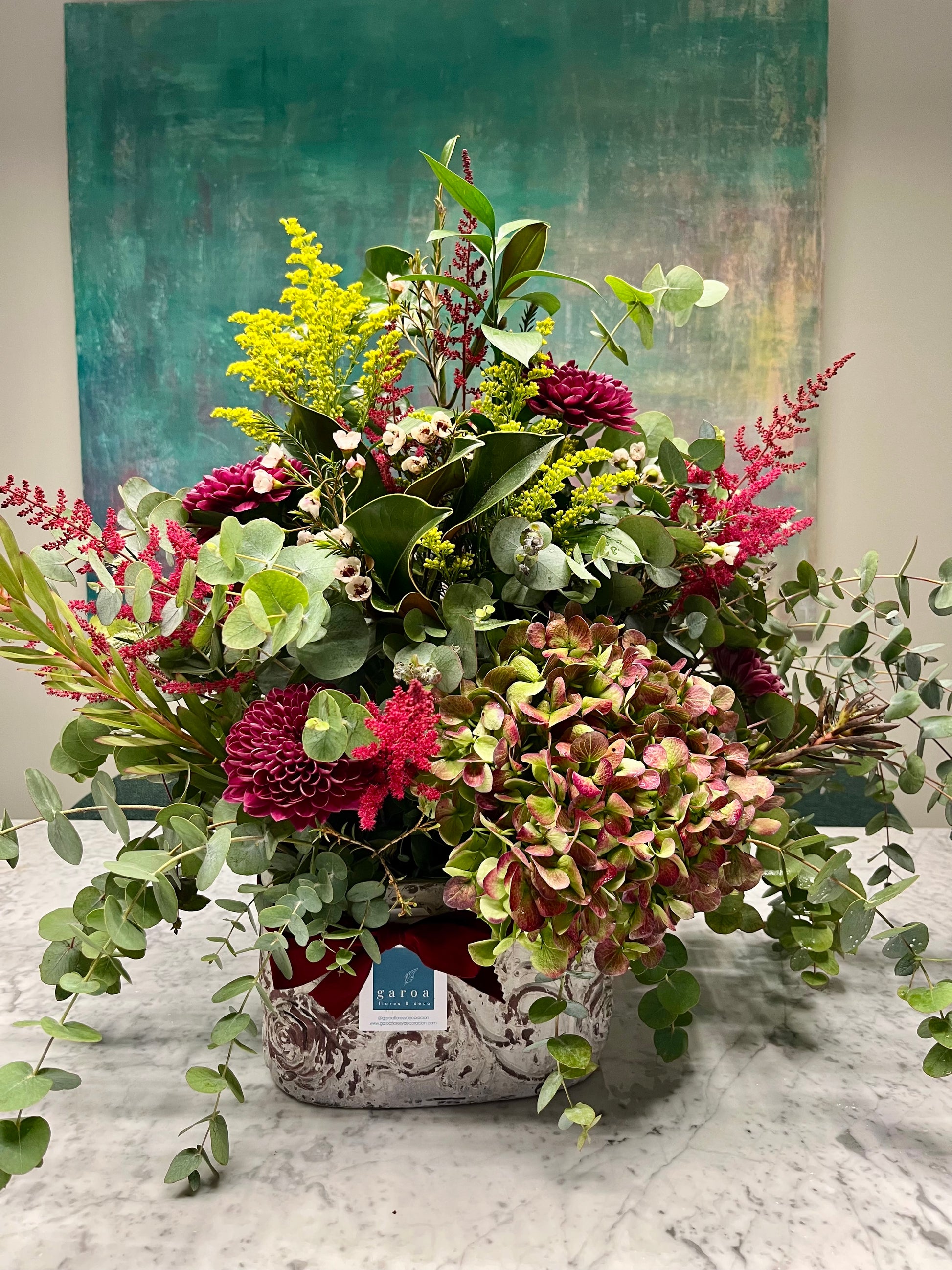 Eleva tu espacio con nuestro exclusivo Arreglo Floral en Base de Piedra. Este diseño es una celebración del contraste: la belleza efímera y suave de las flores se fusiona con la perdurabilidad y la textura áspera de una base de piedra natural.