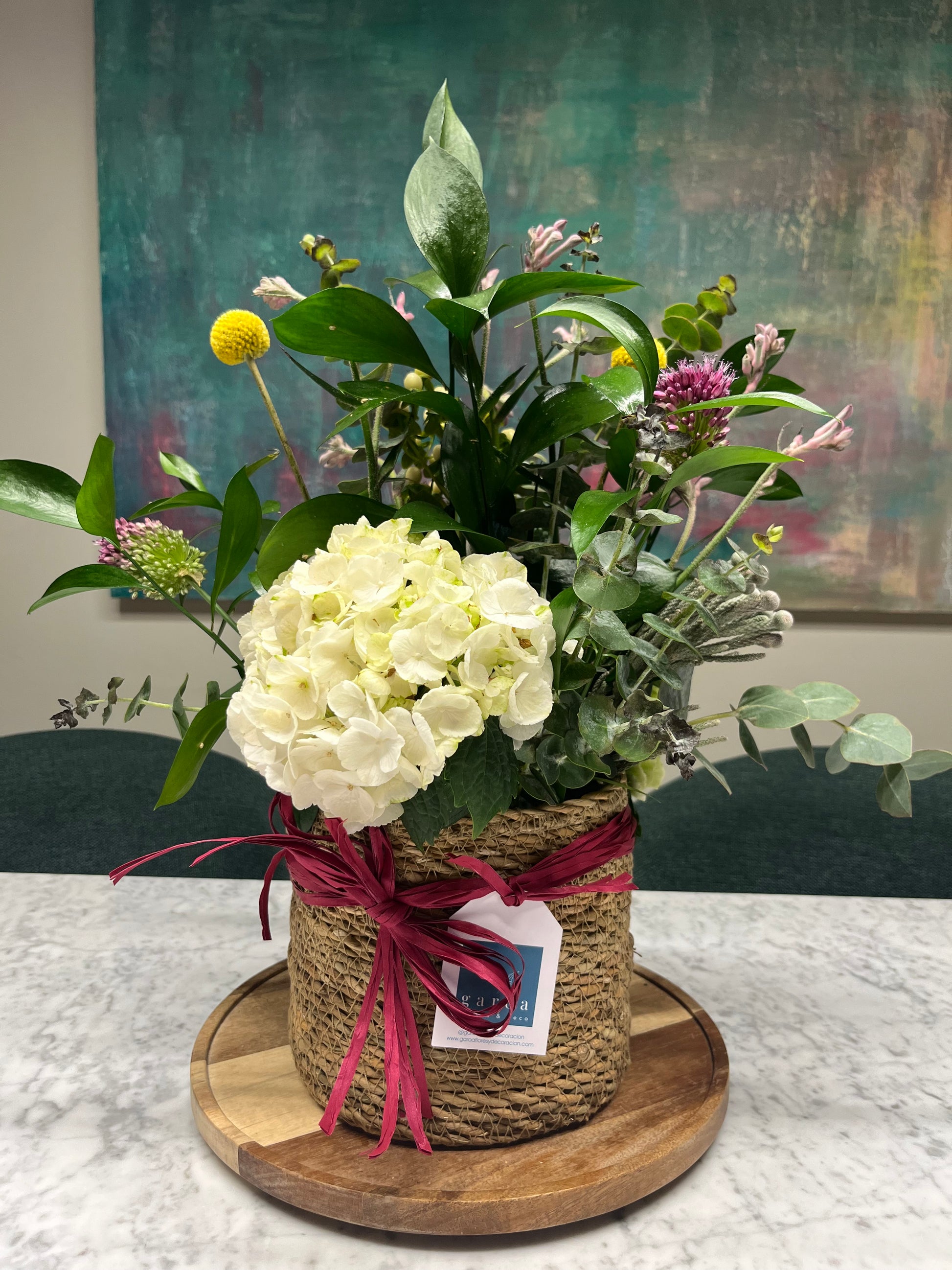 Este centro floral combina la elegancia de la hortensia un toque de verde más salvaje. Diseñado en tonos suaves y naturales. El conjunto se presenta en una base de yute con un lazo de tela natural.