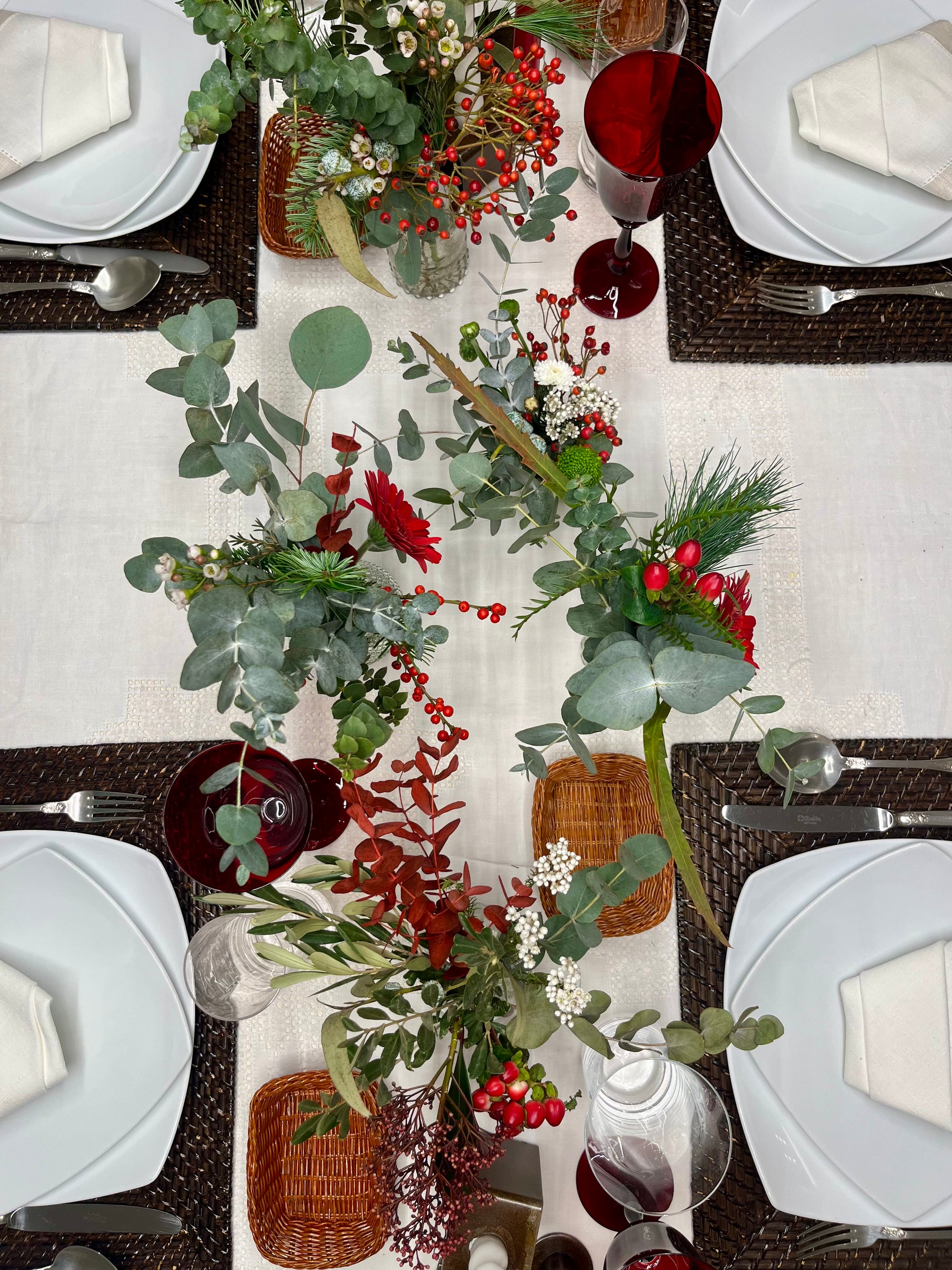 Mesa navideña decorada con pequeños botes de cristal con flor en tonos rojos, verdes y blancos. Un diseño fresco, moderno y festivo que aporta color y armonía a cualquier celebración.