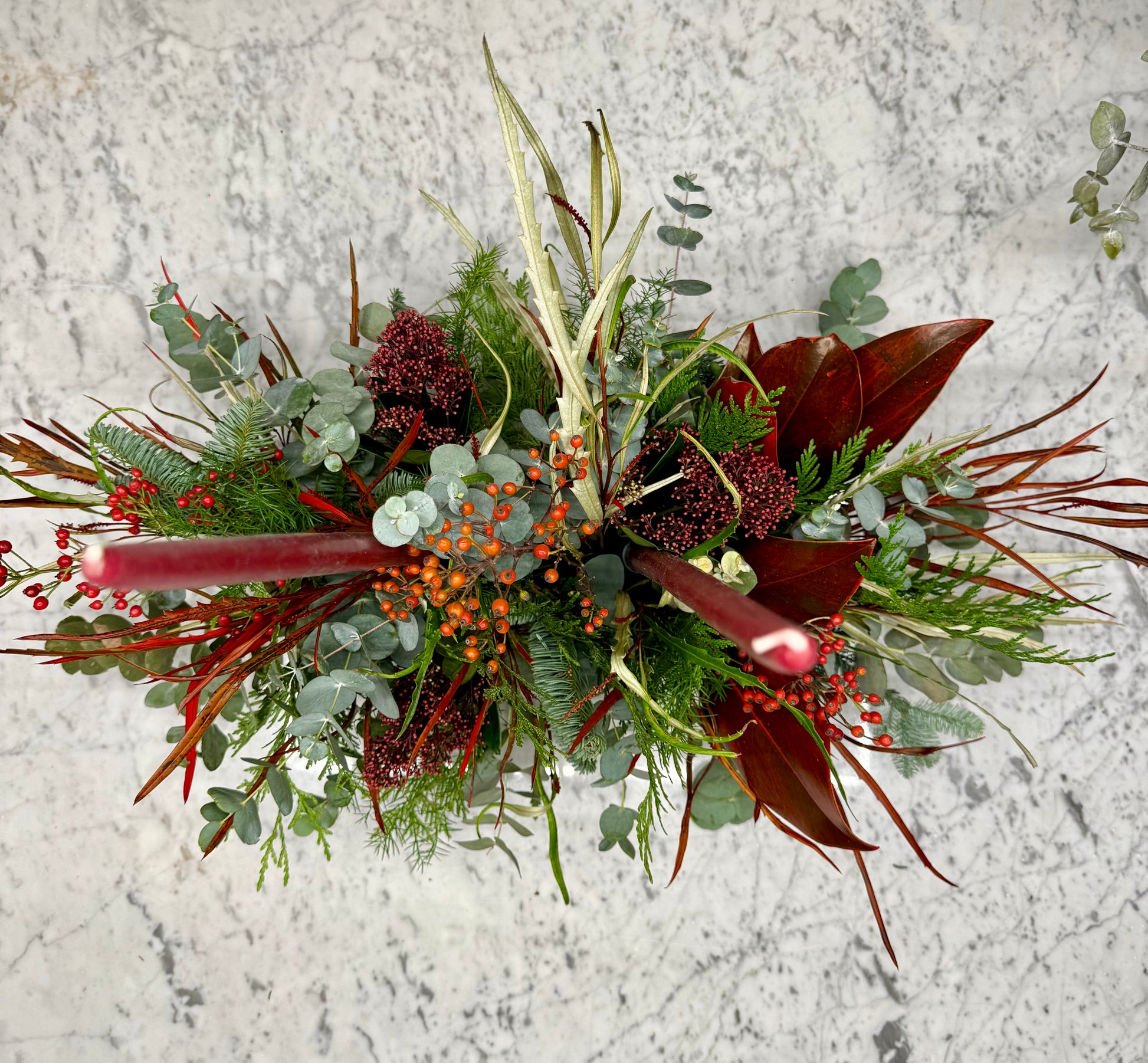 Arreglo natural con eucalipto, pino y detalles burdeos, acompañado de dos velas en una base rústica. Ideal para dar un toque festivo a cualquier espacio.