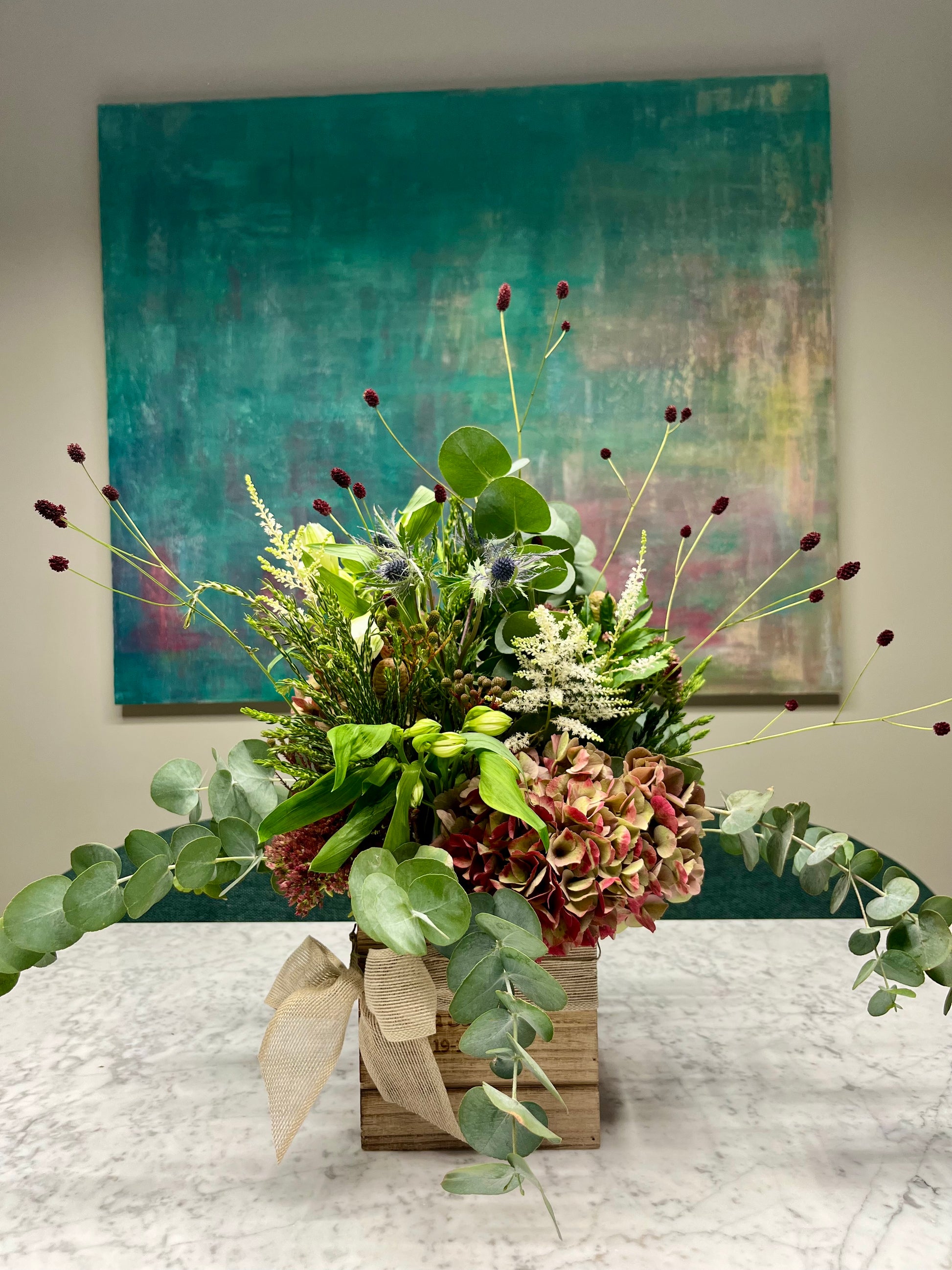 Este elegante centro floral destaca por su combinación de texturas naturales y tonos sofisticados. El arreglo se presenta en una caja de madera natural, decorada con un lazo rústico de lino. Cada caja puede personalizarse con nombres, fechas o mensajes especiales, convirtiendo este centro en un detalle único y lleno de significado.