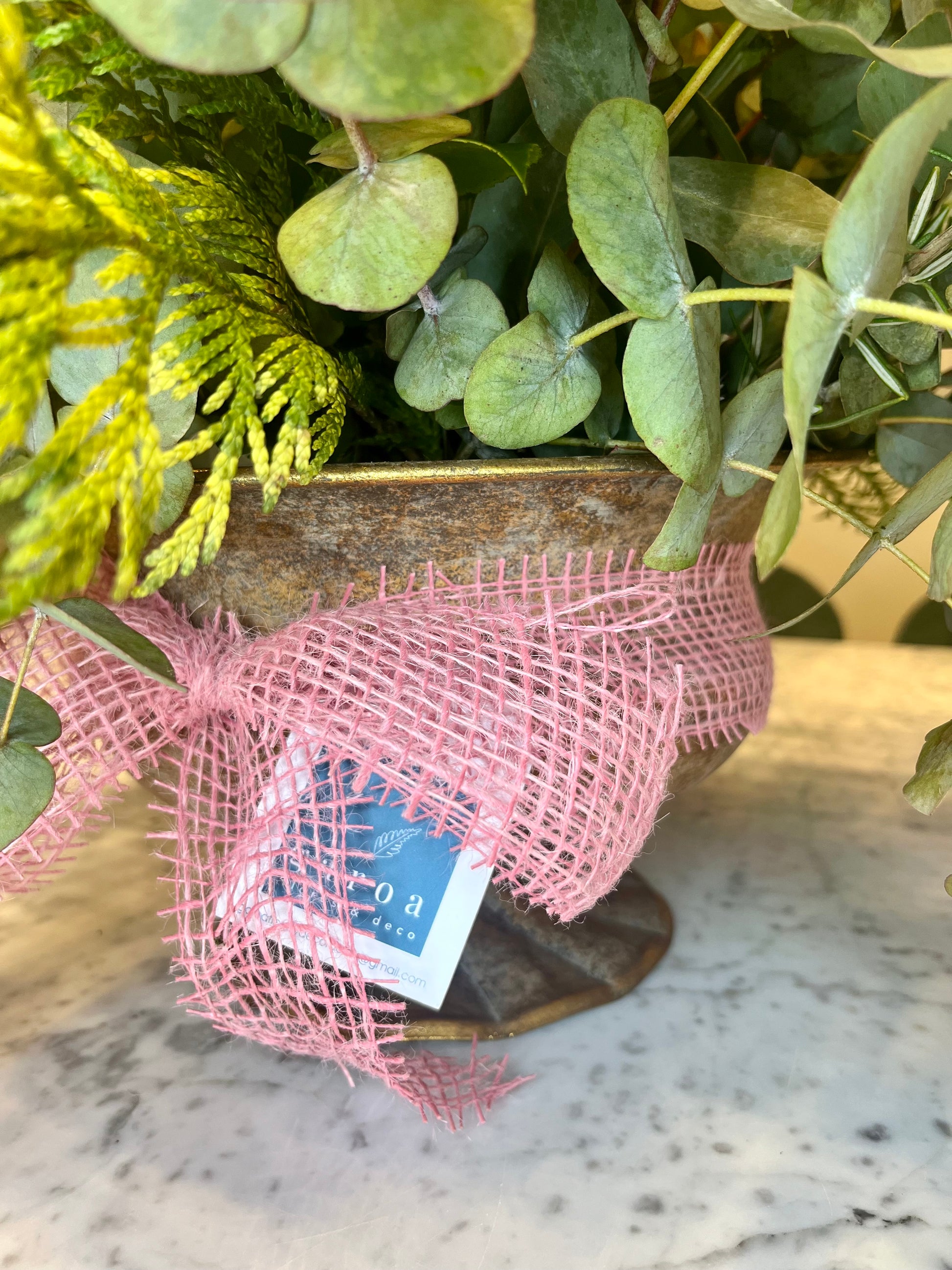 Este arreglo floral combina eucalipto con crisantemos en tonos rosa, creando una composición llena de armonía y estilo.