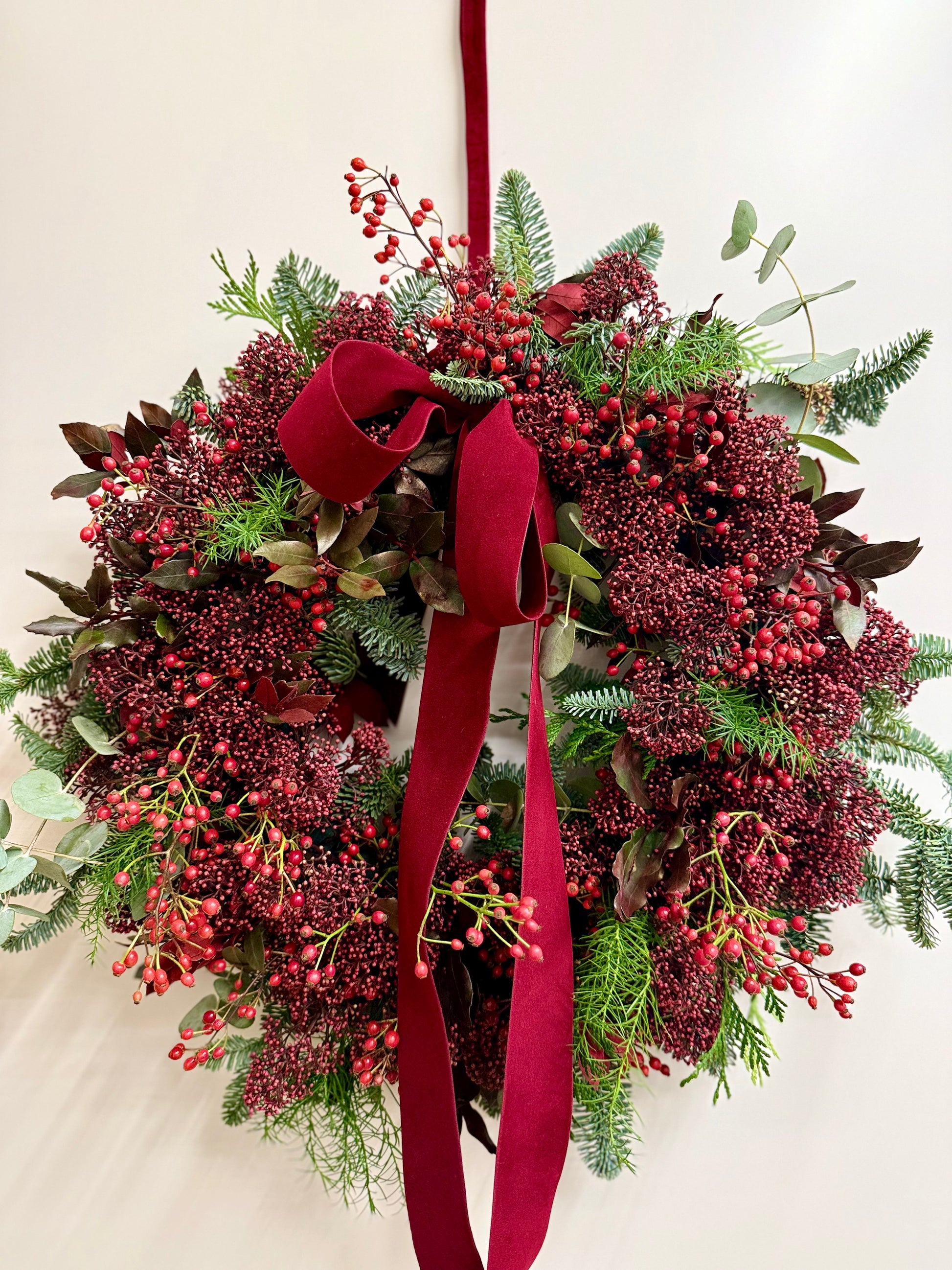 Corona de Navidad para puerta en tonos burdeos, aportando un estilo fresco y acogedor. Un detalle festivo ideal para dar la bienvenida con color y elegancia.